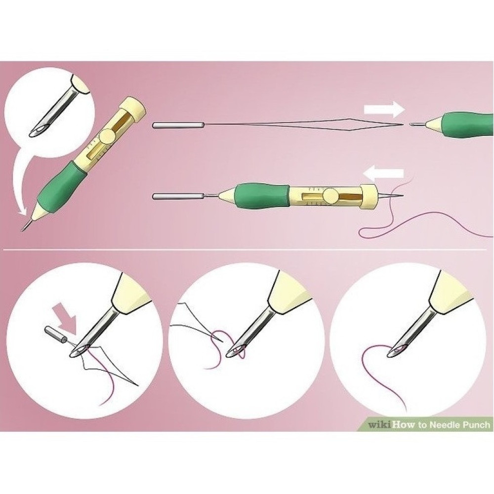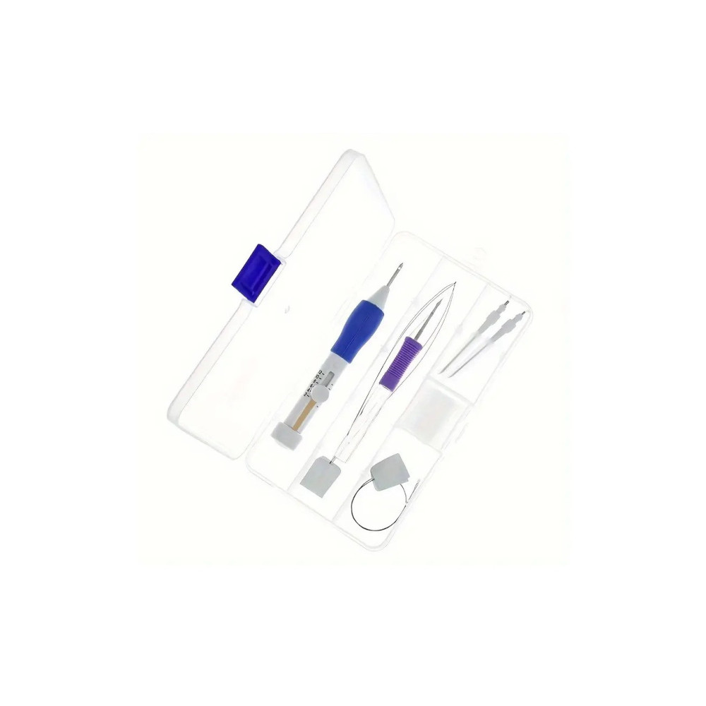 Rinkinyje yra: 4vnt. skirtingų dydžių adatos, 2vnt. skirtingų dizainų įrankiai, 3vnt. įvėrikliai, dėžutė.