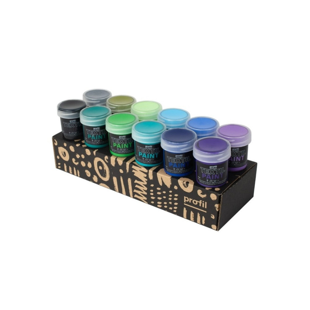 Rinkinį sudaro 12 spalvų po 25ml. Rinkinį sudaro šaltų atspalvių spalvos. Textil paint (pro-fil) skirti piešimui ant tamsių, natūralaus pluošto audinių, tokių kaip: medvilnė, linas, džinsas ir pan. Šie audinių dažai yra pagaminti vandens pagrindu, tad skiesti nereikia. Jie yra kreminės konsistencijos, tad lengviau paskirstyti ant medžiagos. Neišsiplauna skalbimo metu. Nesutrūkinėja po džiovinimo.