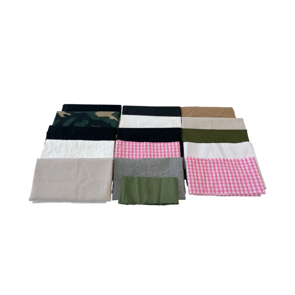 The set consists of canvases 1,60-2,20m wide, unbleached canvas, cotton satins, cotton with elastane, gauze and other cotton fabrics.