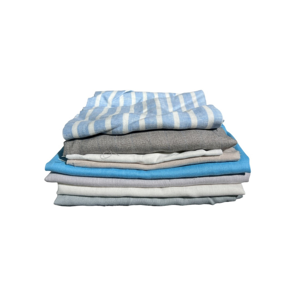 Thicker and thinner linen fabrics of various compositions. Most are 100% linen.