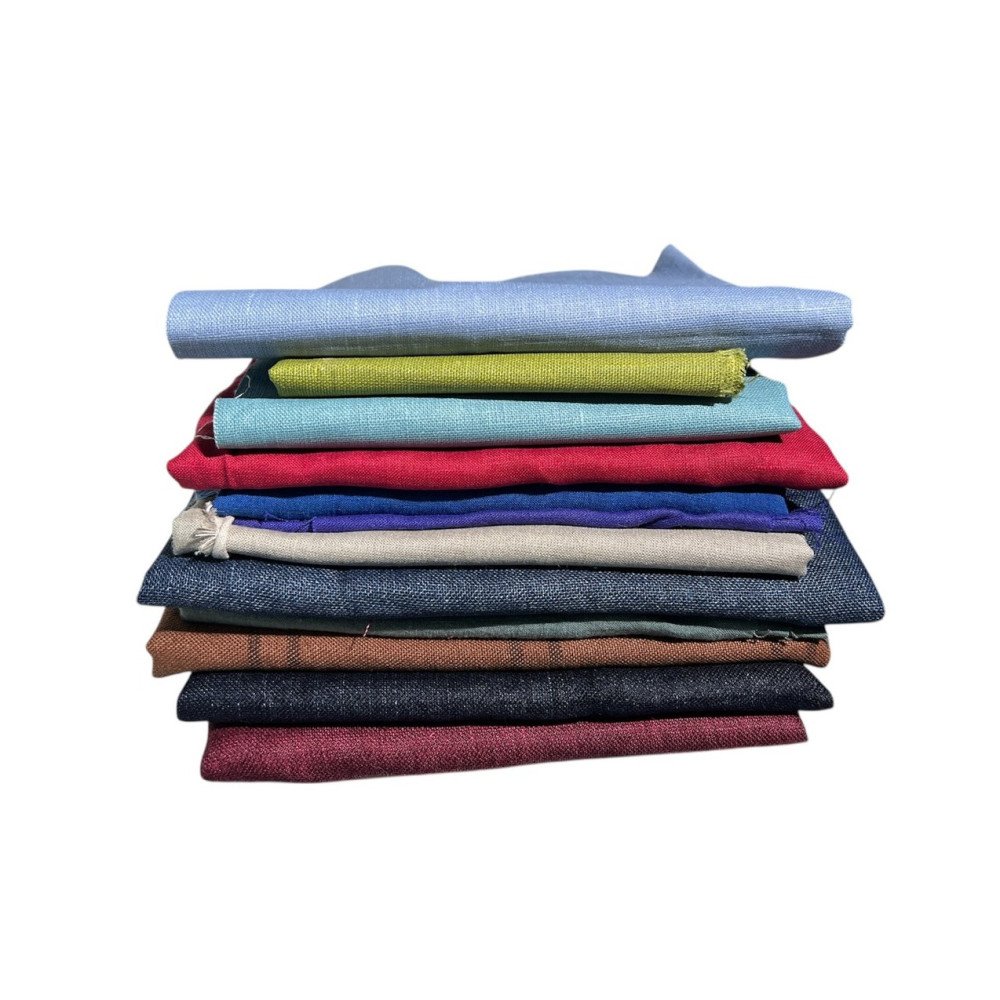 Thicker and thinner linen fabrics of various compositions. Most are 100% linen.