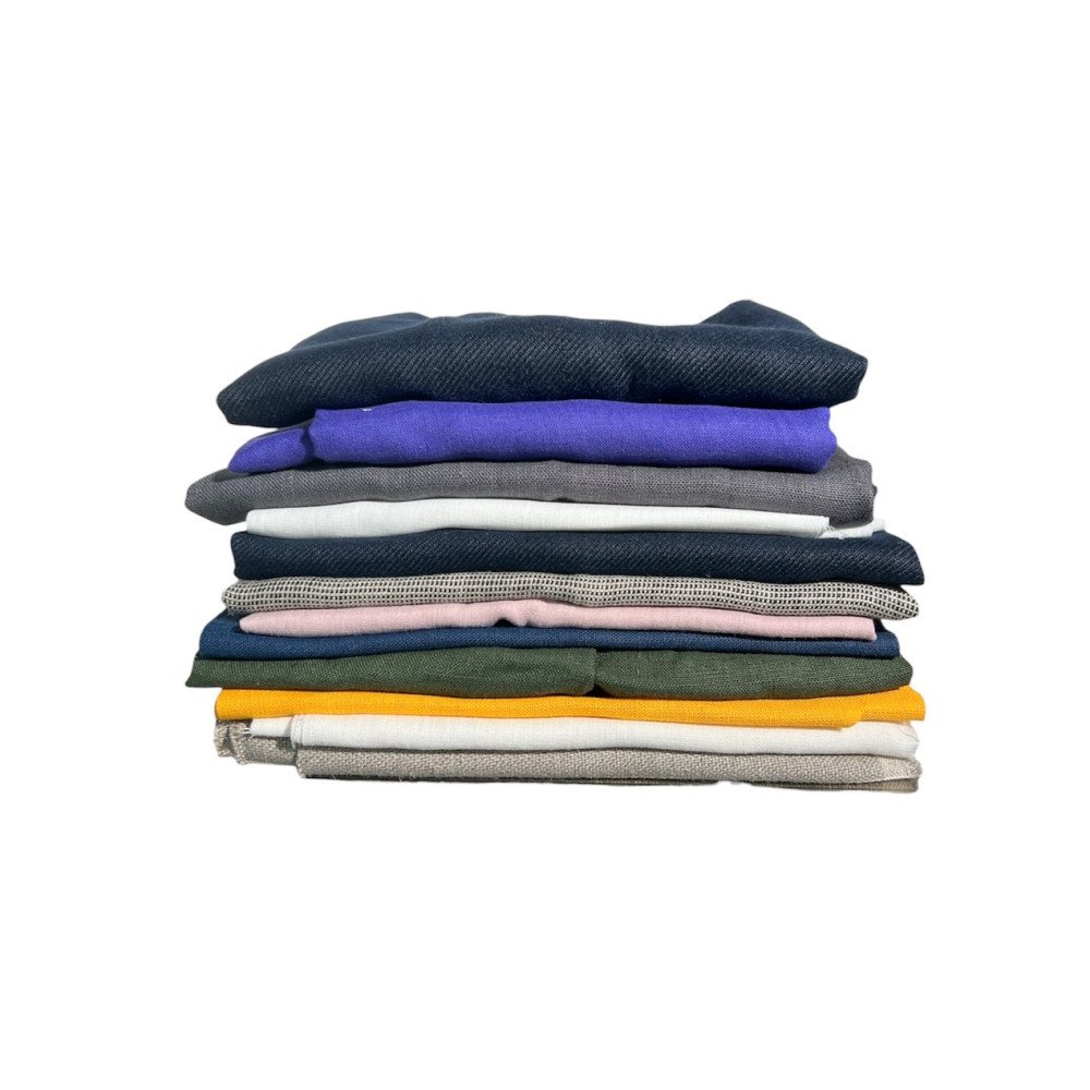 Thicker and thinner linen fabrics of various compositions. Most are 100% linen.