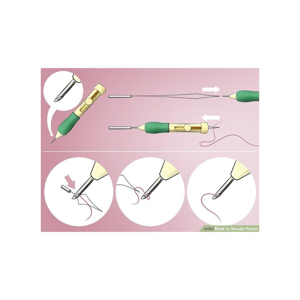 Komplektą sudaro trys skirtingo dydžio siuvinėjimo adatos su patogia rankena, du siūlo įvėrikliai.