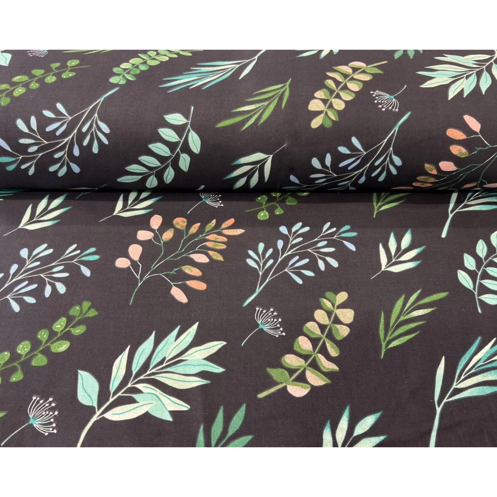 Medvilnė - drobelė Lapai tamsiai pilkame