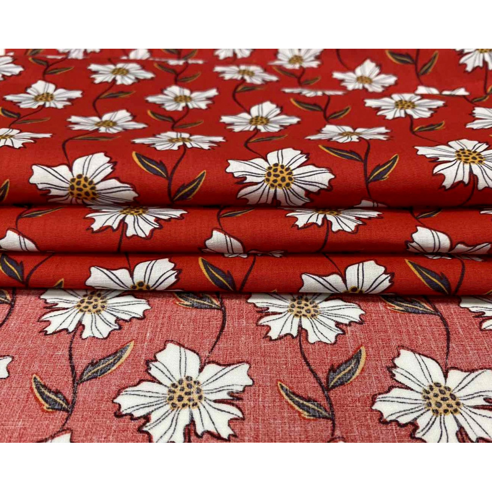 Medvilninis audinys Baltos gėlės raudoname
