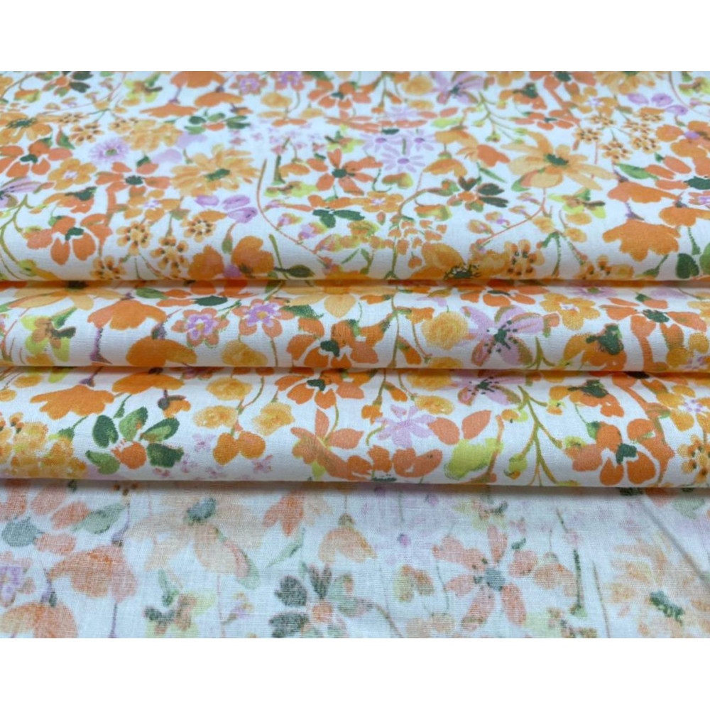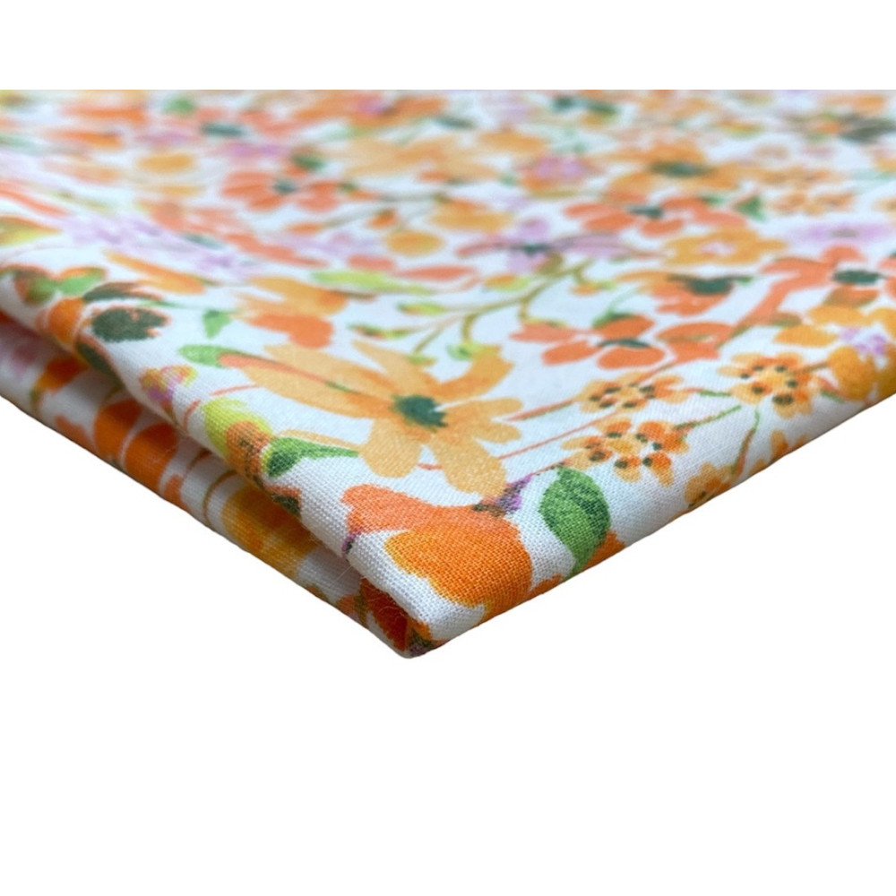 Medvilninis audinys Oranžinės gėlės baltame