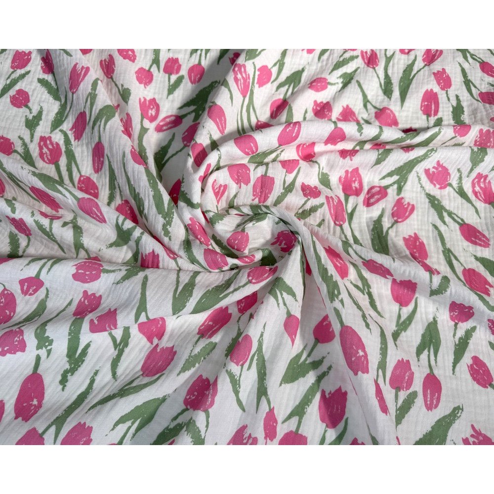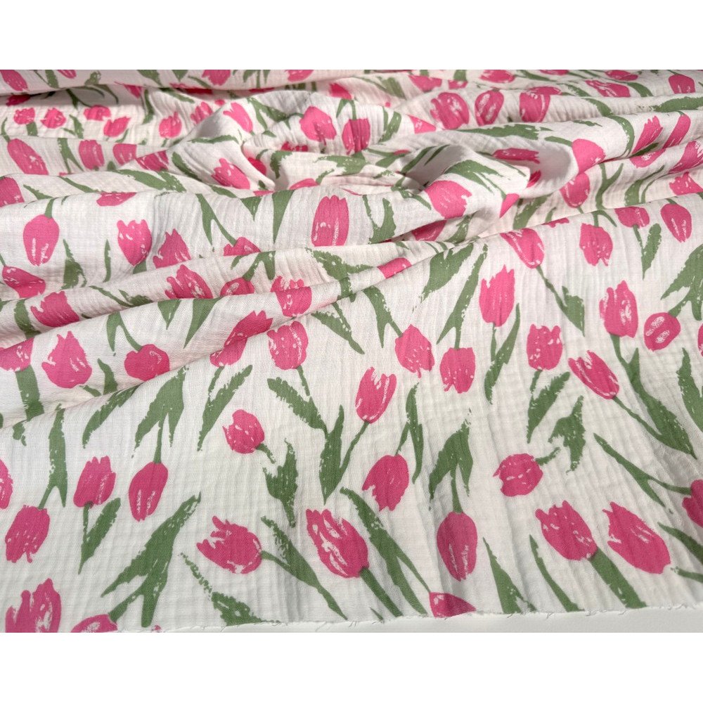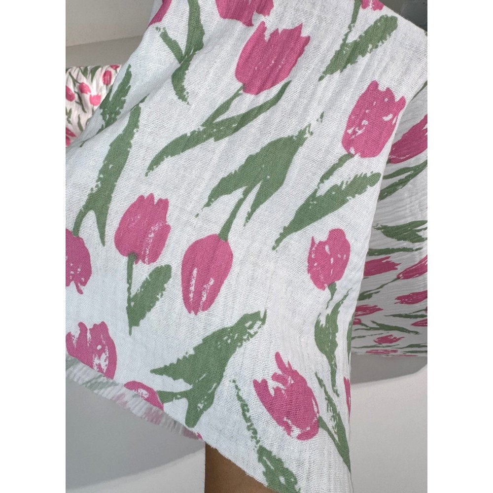 Medvilninis audinys muslinas - lengvumo, švelnumo, natūralumo garantas! Double gauze medvilnė yra truputį natūraliai pabanguota, „pagofruota“, dėl to audinys turi dar daugiau išskirtinumo ir žavesio.