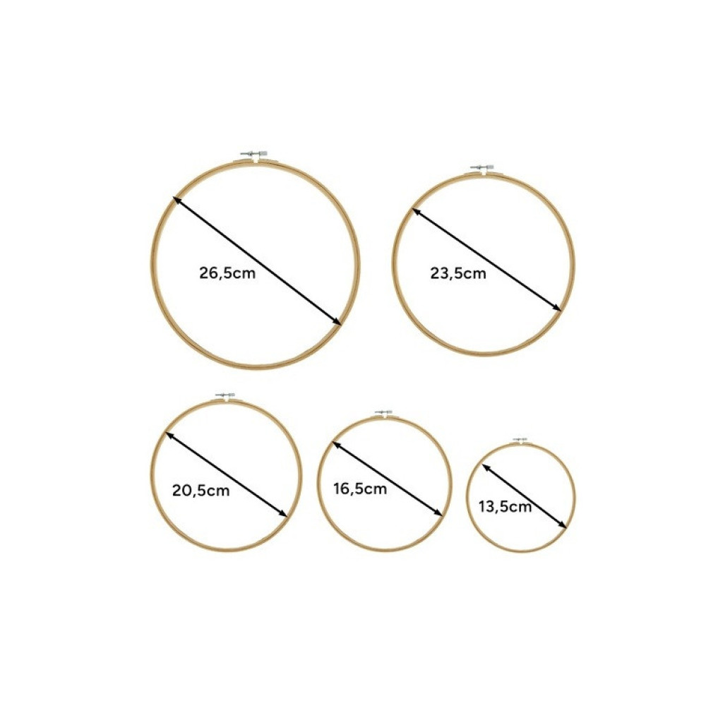 - Siuvinėjimo lankeliai (26,5cm, 23,5cm, 20,5cm, 16,5cm, 13,5cm);